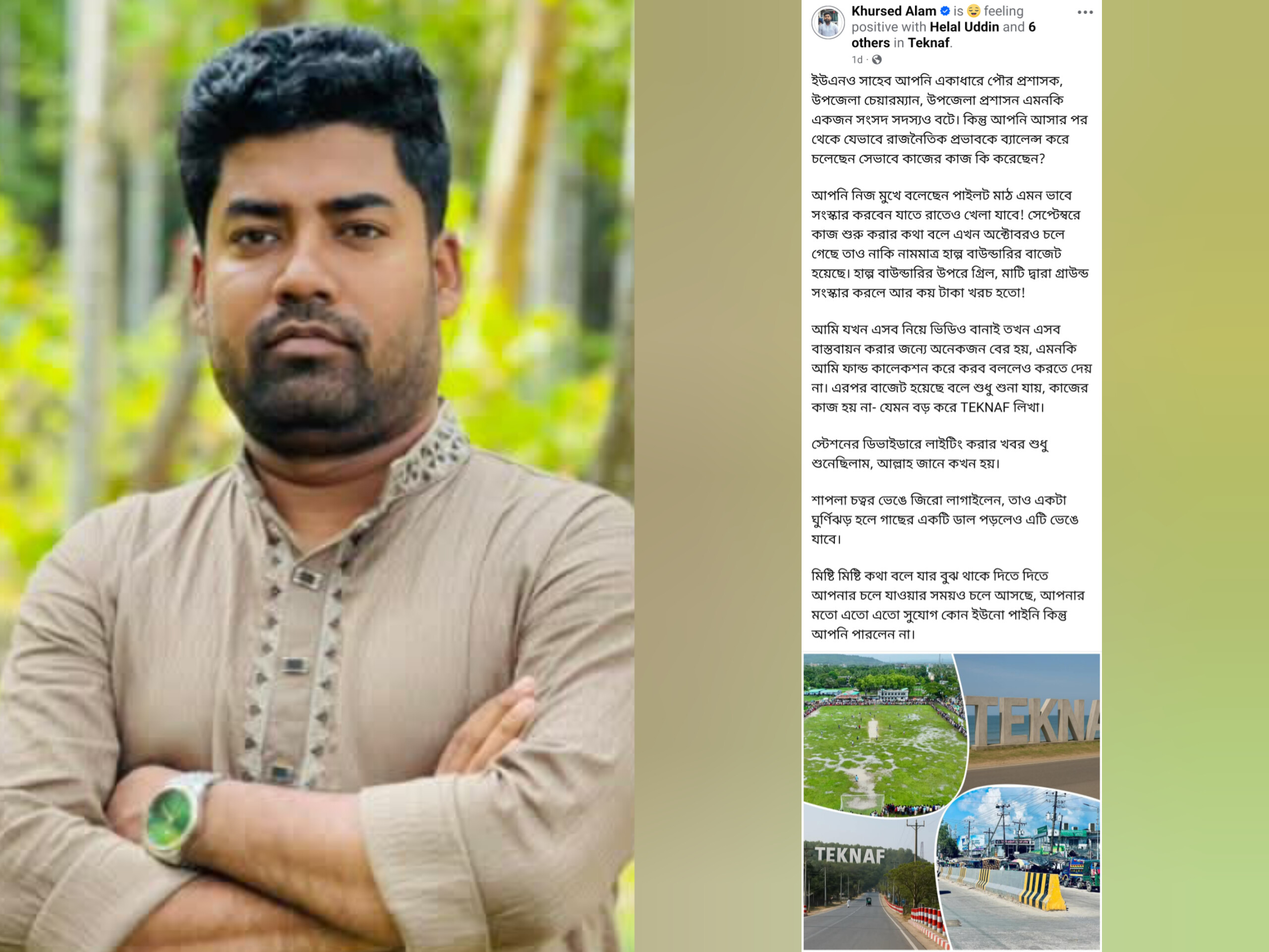 খোরশেদ আলমের ক্ষোভ: "সেপ্টেম্বরে কাজ শুরু করার কথা বলে এখন অক্টোবরও চলে গেছে। তাও নাকি নামমাত্র হাল্প বাউন্ডারির বাজেট হয়েছে। হাল্প বাউন্ডারির উপরে গ্রিল, মাটি দ্বারা গ্রাউন্ড সংস্কার করলে আর কয় টাকা খরচ হতো! বড় করে TEKNAF লিখা হবে বলে শুধু শোনা যায়, কাজের কাজ হয় না।"